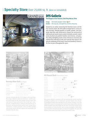 中国澳门金光大道四季酒店DFS环球免税店 设计方: 泰国曼谷rkd retail/iQ 零售商:香港九龙康诺特广场DFS有限集团 连接着澳门四季酒店和威尼斯人赌场,澳门四季酒店DFS环球免税店的设计传达着自身独有的魅力。大理石,花岗岩,复合石砖内嵌金属的地面闪闪发光。实木,木皮,防火板,金属粉末涂层,抛光不锈钢,铜及玻璃等制作的道具,天花及灯光的效果打造一种强烈的感觉,奢华高雅的颜色及材质衬托出高端的品牌定位。商品的视觉陈列加强了整个空间的艺术感。 |