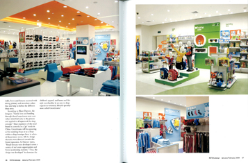 鲜红的门面前两个卡通形象摆出欢迎年轻购物者的姿势,当消费者在各个店中流连时,他们的形象经常出现。虹猫蓝兔的形象是专门为孩子设计在入口的,在入口附近,有一个幻灯片卡盘样的图片和一只橙色的鼓,鼓上面有五花八门的卡通形象。四周有嫩黄色的金属装置,里面装满了五花八门的游戏,玩具,长毛绒动物和文具。鞋专卖区有落地开墙鞋柜,很显眼,连锁五彩椅上方是橙色的凹陷的天花板,使整个区域显得更加集中。试鞋的地方有电视监控器来分散孩子的注意力。整个店面很明亮:墙面,地板都是白的,不同的区域用强烈的原色和合成色灯具来加以区别。 |