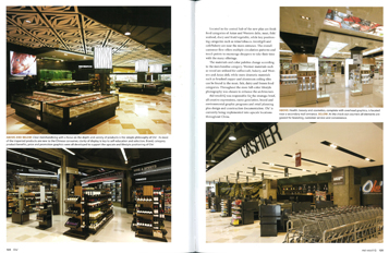 所用材质和颜色会随着商品的品类而有所不同. 在美食、咖啡和面包房区域,我们采用如木头等能让人感到亲近的材料,而在肉类、鱼类、牛奶制品及冰冻食品区域, 我们则采用更为夸张的物料如铜色刷漆和铝制的天花面砖。 在整个店面,全色的生活摄影图片将会增强其建筑氛围。