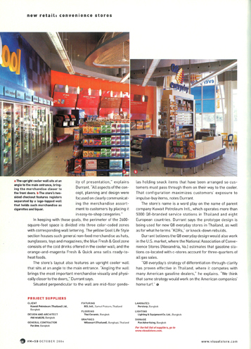 ![]() 在今年ISP/VM+SD国际店面设计大赛中Q8 everyday很成功,但这并不是它违背C店设计常规的唯一方式。 Durrant解释说:“Q8 everyday最高宗旨是通过清晰的表现在竞争中出类拔萃。概念的所有方面,规划和设计注重向顾客清晰地呈现商品类别,将商品放在容易选购的地方。 为了达到这些目标,2600方呎地的周边分成了三个色彩编码区域,相应的墙上写了字。黄色Qool Life Style区域一般是非食品商品如帽子,太阳眼镜,玩具和杂志;蓝色Fresh & Qool区靠墙冷柜里放冷饮;橙色和洋红相间的Fresh & Quick区域出售热后即可食的食品。 店铺的布局很有特色,在一个主入口角有一座立式冰柜。Durrant说:“有角度的墙将最重要的商品无论在视觉还是位置上呈现在门口附近。” 墙边垂直的地方是中间货架,摆放着零食,这样顾客就必须穿过它们,到冰柜那边,Durrant说,这样的构造能增多顾客即兴购买的机会。 店名是针对科威特总公司名称玩的文字游戏,科威特在泰国和8个欧洲国家拥有5000多个Q8品牌的加油站。Durrant说原型设计正应用于泰国新的Q8 everyday店以及KDR,即重建店铺。 Durrant认为Q8 everyday的设计也可以在美国市场运用,全美便利商店协会估计,加油站与C店同地协作占了所有汽油销售的75%。 Durrant说道:“ Q8 everyday’s的‘清晰打造与众不同’战略在泰国被证明是有效的,它与很多美国汽油零售商抗衡。我们认为同样的战略也能适用于美国公司。” |