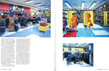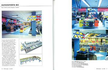 店铺后部非常重要的自行车部门以深黄色的墙和图形吸引顾客的注意。不同种类的自行车在后墙及其高技术伸出结构上排列,有三层高。自行车附近是露营用具和搭配那些活动的时尚类产品,主要是黄色色彩。在一个中心进料孔展示着很多库存的产品。 已建超市和大型超市里设计概念品,灯具装置和图形标志包,这些都是目标市场最有可能购买的。它的简约决定了它的适应性强,可以容纳任何可用空间。这个设计展示了大胆,充满活力和丰富多彩的一面。 |